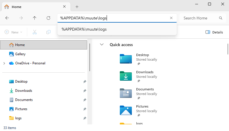 - Enter the following text in the navigation bar of File Explorer: %APPDATA%\muute\logs